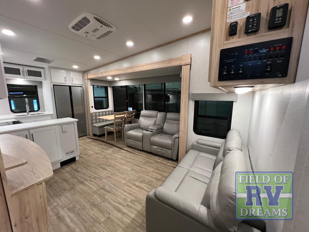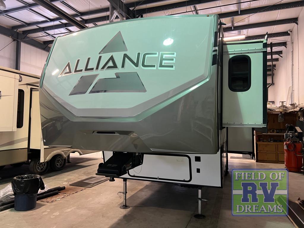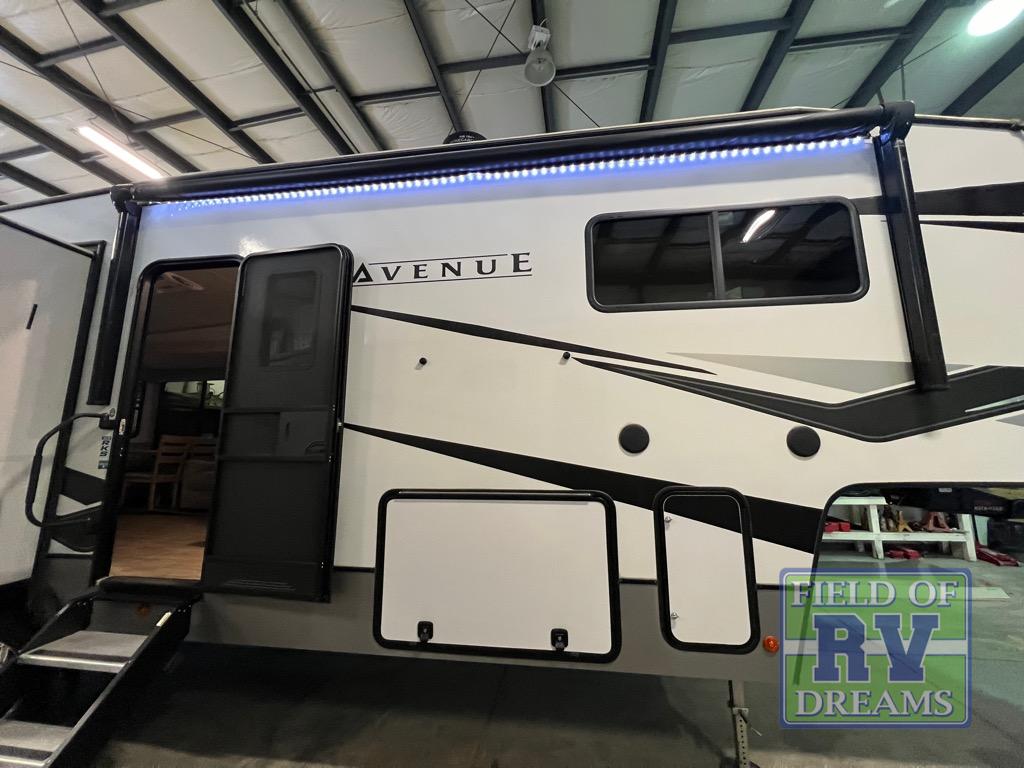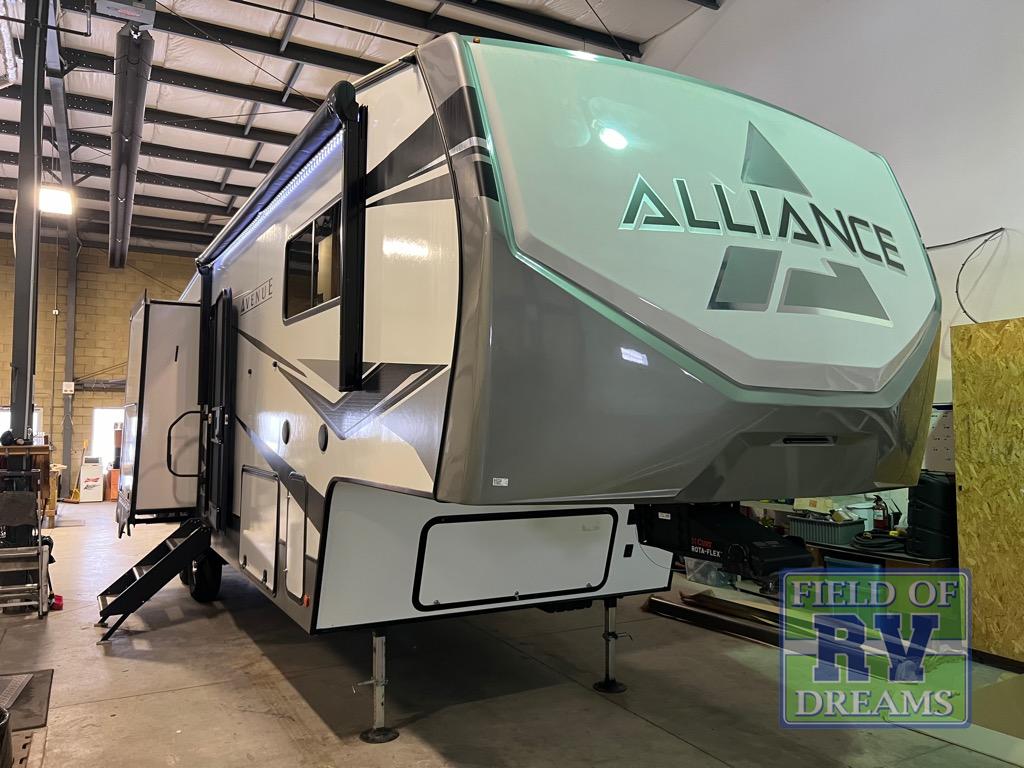 A benchmark chassis creates a space saver upper deck with each one of these Avenue fifth wheels by Alliance RV! The 101 in. wide-body construction gives you more room to walk around and the flush slide out floors throughout prevent any tripping. There are Azdel composite sidewalls inside and out, and a seamless fully walkable PVC roof for extreme durability, zero maintenance, and it is more solar reflective because of the bright white color. Twin 13,500 BTU A/C units provide 27,000 BTUs of cooling power which are ultra quiet and independently controlled keeping you comfortable during your entire trip. And, the fully enclosed and heated underbelly means that you can extend your camping season into the colder months if you like. You are sure to love the "no carpet zone" making each Avenue easy to clean and allergen free, not to mention pet friendly with vinyl flooring throughout. And, strategically placed Atrium windows in the bedroom and living area will not only provide more light, cross ventilation and fresh air, but bring a spectacular view of your surroundings right inside. You can maximize your space throughout with innovative storage solutions like the hidden storage behind the TV, inside the end tables, ottoman, and dinette chairs. Come choose your favorite model today!