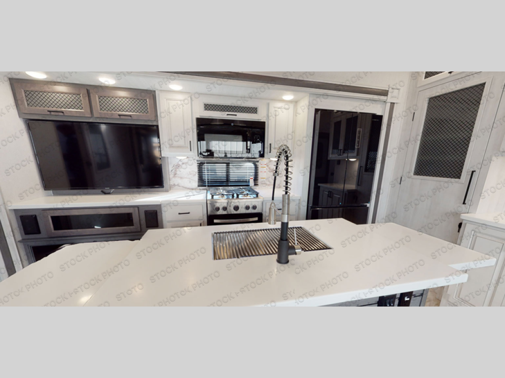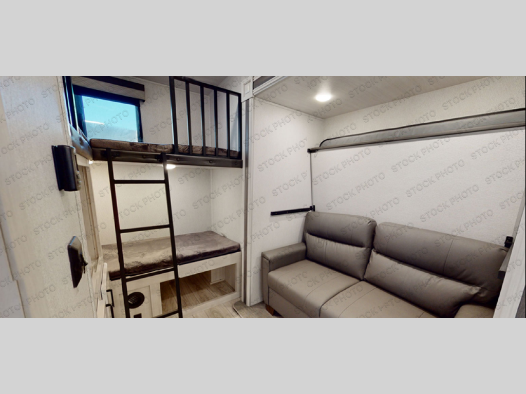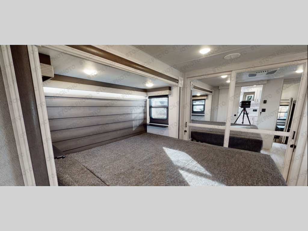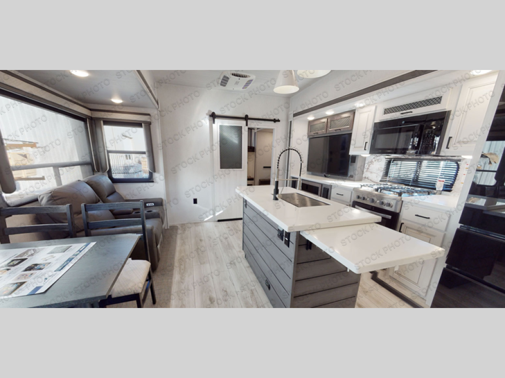 This Ahara fifth wheel is the exact answer to your prayers if you need an RV that provides you with a large private sleeping area for many children! The rear bunkhouse suite has a fold-down bunk, EZ-out sofa, a set of 28" bunks, and a 54" x 72" bunk, so it can easily sleep five. Plus, it also has its very own half bathroom which makes it extremely easy for your kids to use the bathroom at night or get ready in the morning, and the second exterior entry door is also included in this space. You'll have your own master suite to retreat to at the front, and this space includes a king bed slide with drawers under the bed and a private entrance into the main dual-entry bathroom. The chef of your group will love the spacious kitchen with its kitchen island with countertops extensions, a 24" residential oven with a four burner cooktop, a double door pantry and coat closet, plus a 16 cu. ft. 12V French door refrigerator with a double drawer freezer.