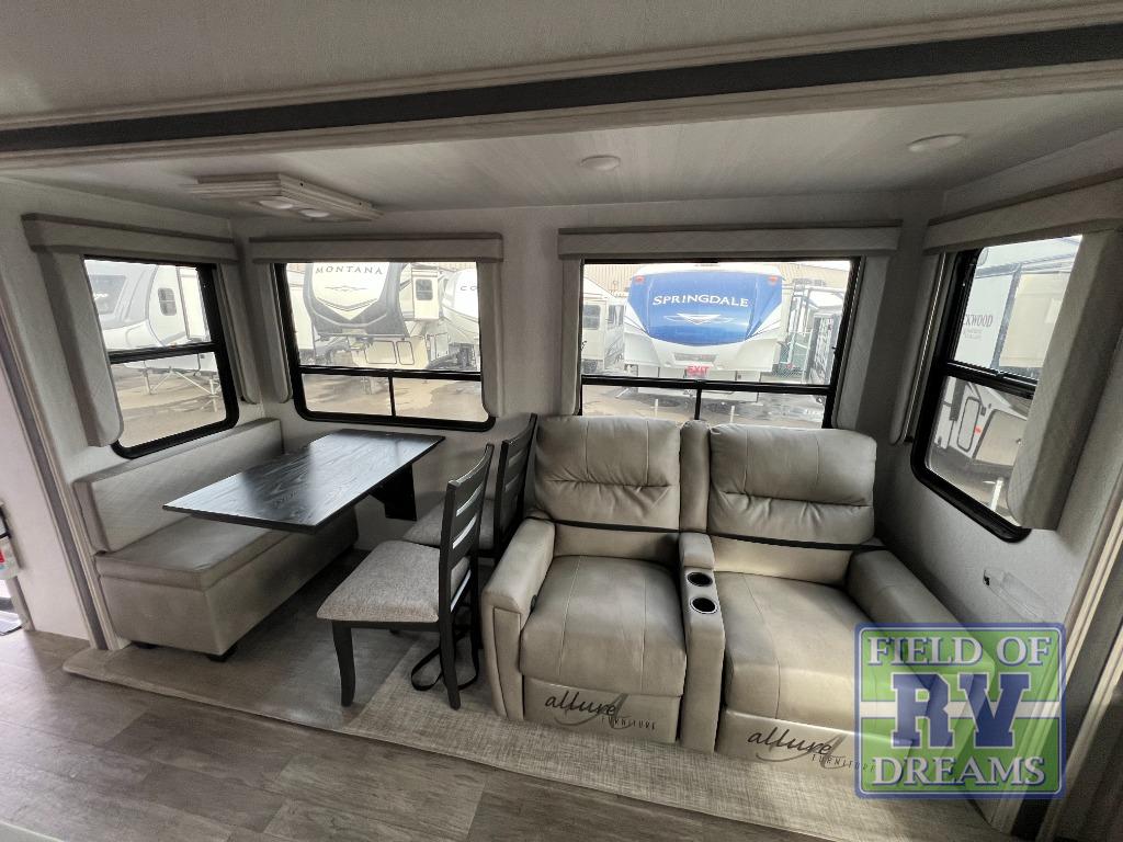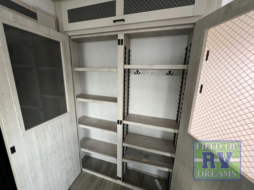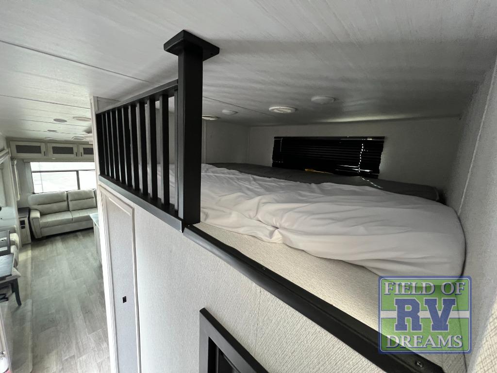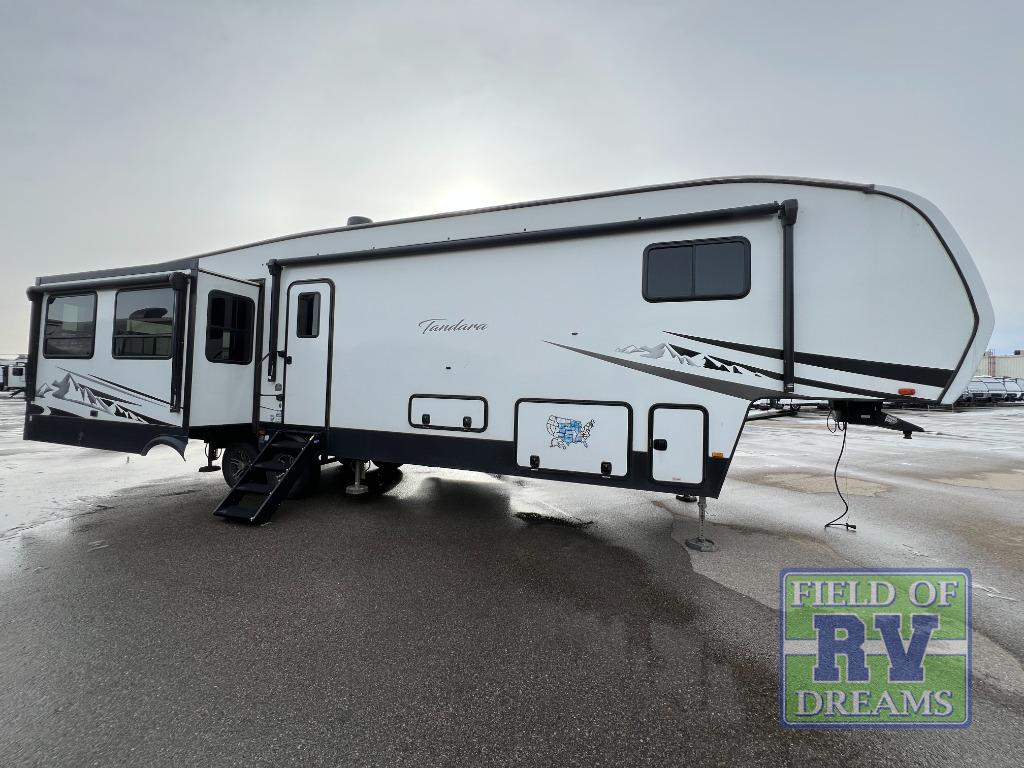 Use this Tandara fifth wheel for the grandest adventures with a large group of people! You can fit a total of nine travelers in this unit because there is a king-size bed, two hide-a-bed sofas, a fold-down bunk, and a loft for sleeping. Additionally, the opposing slides in the main living area give you more space for all of these people to sit down and chat or gather around the kitchen island. The 16 cu. ft. 12V refrigerator can store anything your group will need to stay fed throughout your trip, and the four-burner range can cook up that food with plenty of ease. On the exterior, there is an oversized pass-through storage compartment that can be used when you want to bring along beach umbrellas, picnic blankets, and outdoor games, and the two electric awnings offer protection from the sun while you relax outside.