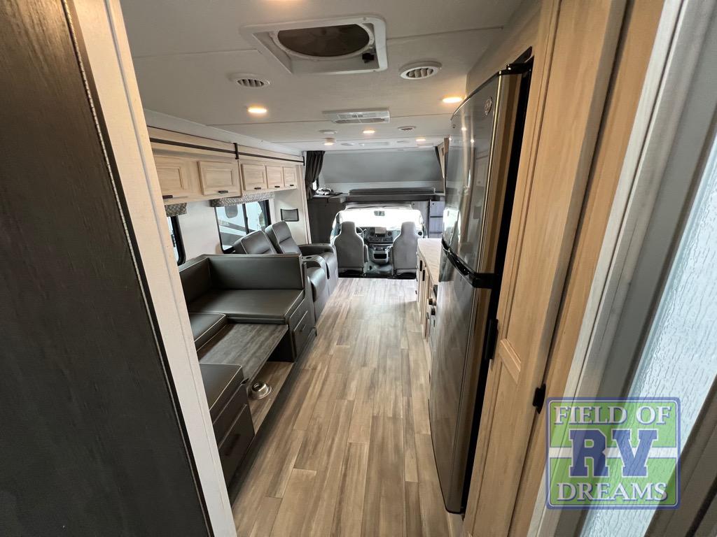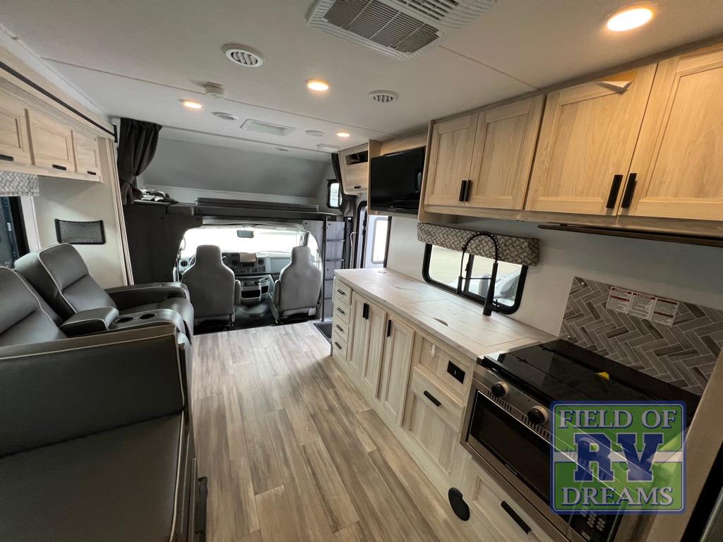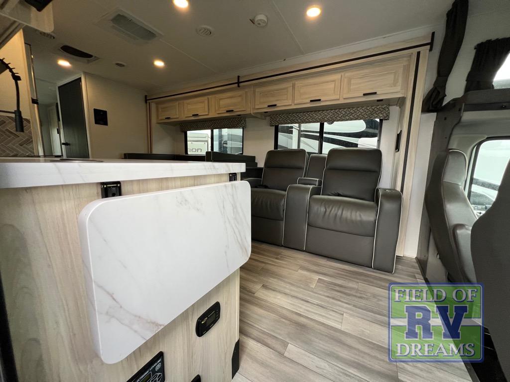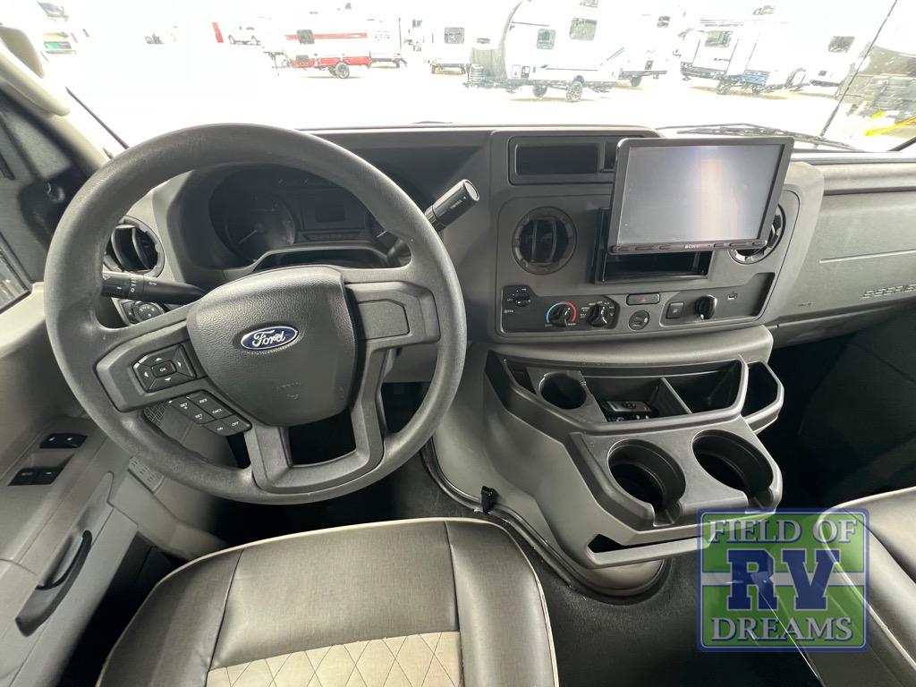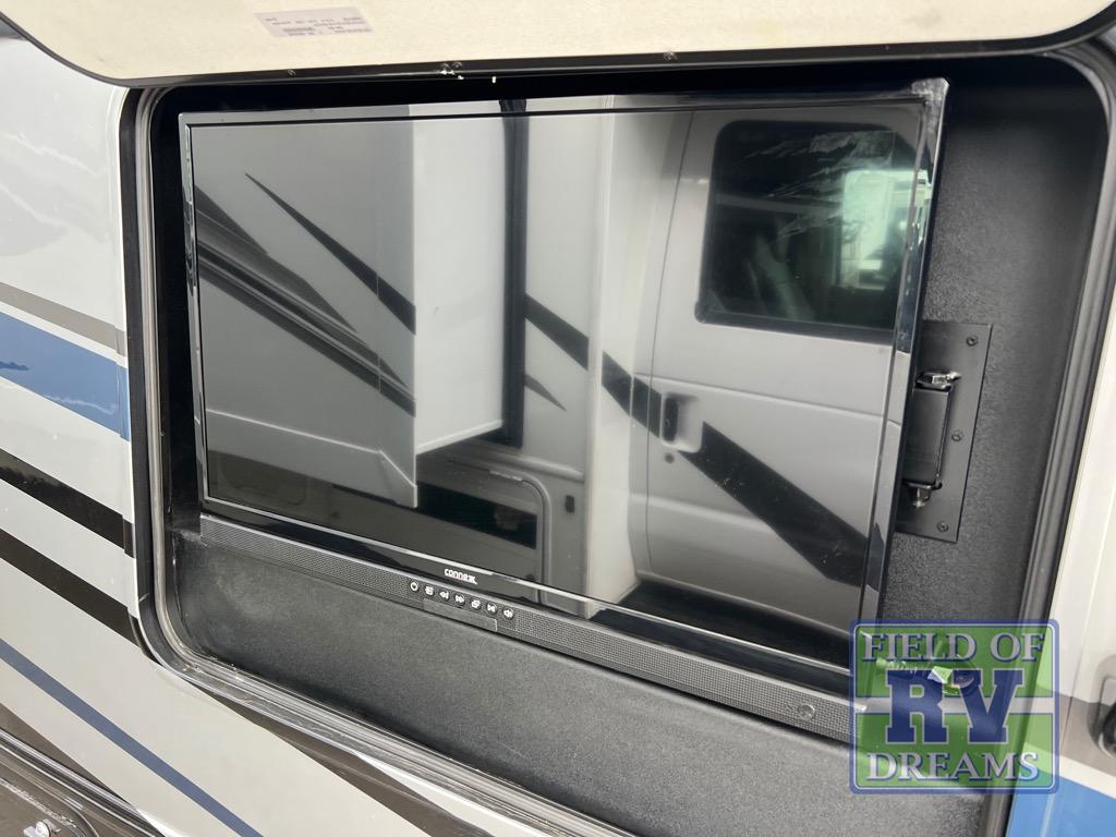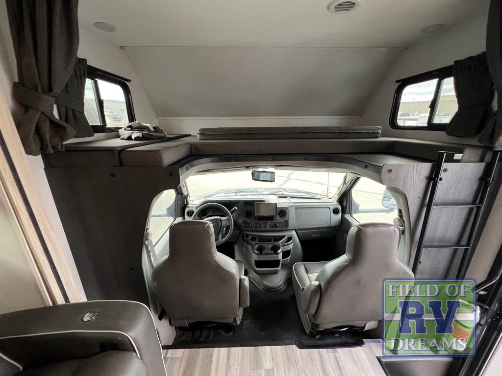 Escape the hustle and bustle of everyday life with this motorhome! It features a 60" x 80" bunk over cab mat which can be switched out for an optional Trekker cap with a built-in entertainment center. The sofa and U-shaped dinette slide offer comfortable places to enjoy meals, socialize, and even sleep once converted. Prepare your best meals with the 10.7 cu. ft. 12V refrigerator, the three burner cooktop, the flip-up countertop, and even the 1.3 cu. ft. undermount convection microwave. The separated bathroom has a 24" x 32" shower across from a toilet with a sink and countertop space, plus it leads directly into the rear private bedroom which has a 60" x 74" queen bed slide across from a linen/12V TV area with wardrobes on either side. You can even add an optional outside 12V TV and stay protected by the 15' 6" power awning!