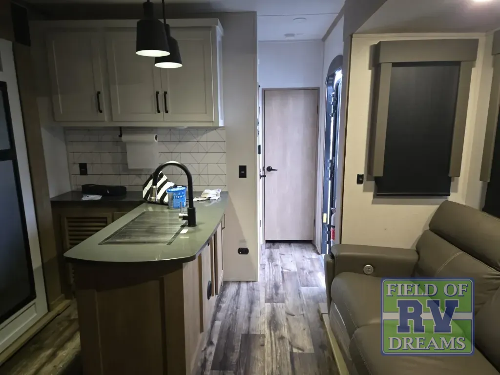 Looking for a travel trailer with tandem axles, a 12'6" separate garage to haul your off-road toys that you can also sleep in, as well as provides a full and a half bath for convenience? If so, this is the one! After unloading using the ramp door, you can easily set up the electric bed with dual opposing sofas and either relax or sleep, and there is a half bath for convenience. Inside the main living and kitchen area you will find two slide outs for more interior space, an L-shaped kitchen which includes a large farmhouse style sink and overhead cabinets, plus there are kitchen appliances to keep everyone fed, and a refrigerator to store leftovers. The 97" sofa with recliners will be a great place to relax together, and everyone can watch the 50" LED TV with surround sound. The full bathroom is next to the front bedroom which provides a queen bed, dual nightstands and wardrobes, plus a space saving sliding door for privacy.