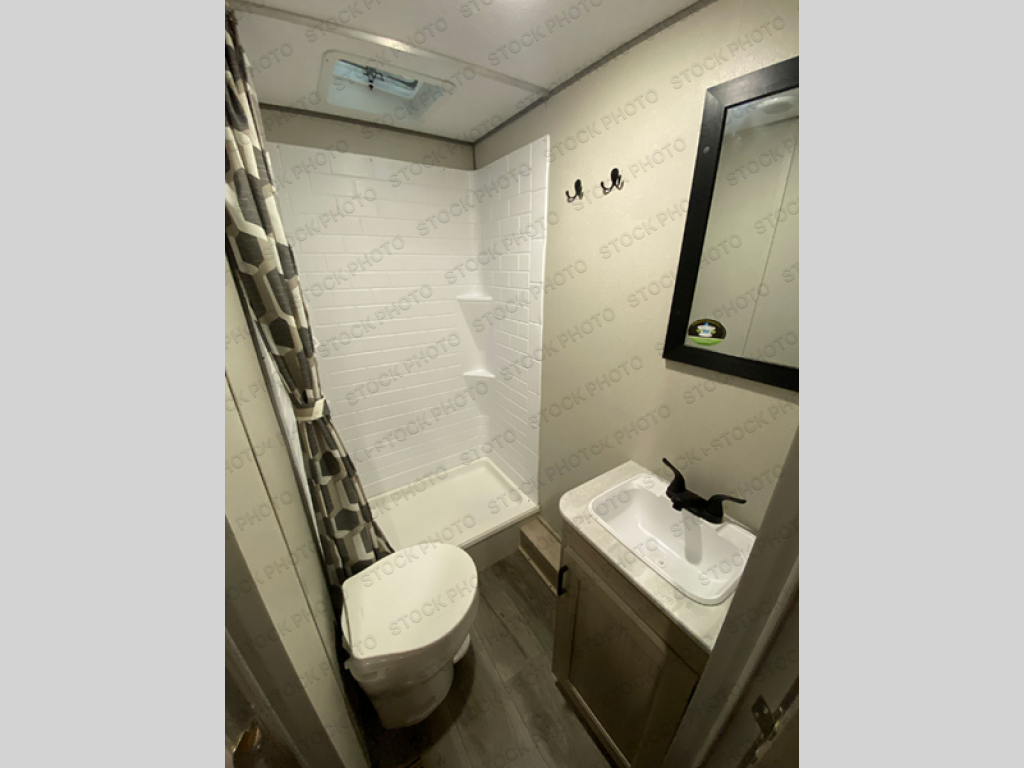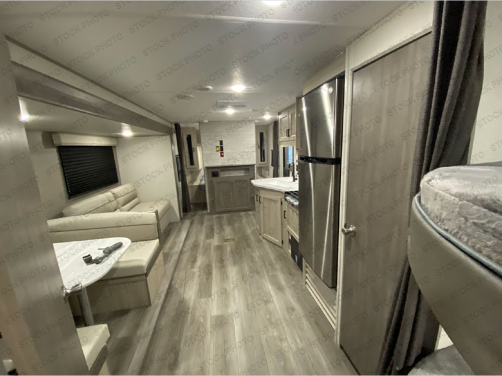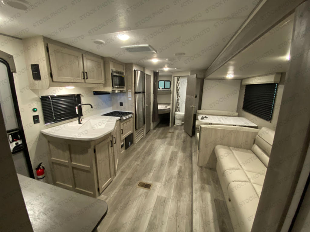 This is the perfect mid-size travel trailer for you and your family! The 46" x 74" double-size bunk beds with lower interior storage offer a comfortable sleeping space for the kids and you will have your own private sleeping space with the 60" x 74" queen bed in the front private bedroom. Freshen up each morning in the rear corner bathroom with the tub/shower and a mirror to get ready each morning. You can prepare your best home cooked meals with the GE stainless three burner cooktop and GE stainless 10.7 cu. ft. 12V refrigerator, then enjoy them together at the booth dinette. The sofa is near the entertainment center for a relaxing movie night. Don't leave any of your outdoor gear behind either thanks to the front pass-through storage area and the exterior outside storage area. You could even add the optional outside camper kitchen to grill the catch of the day on the pull out griddle!