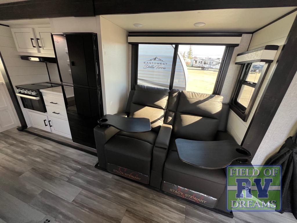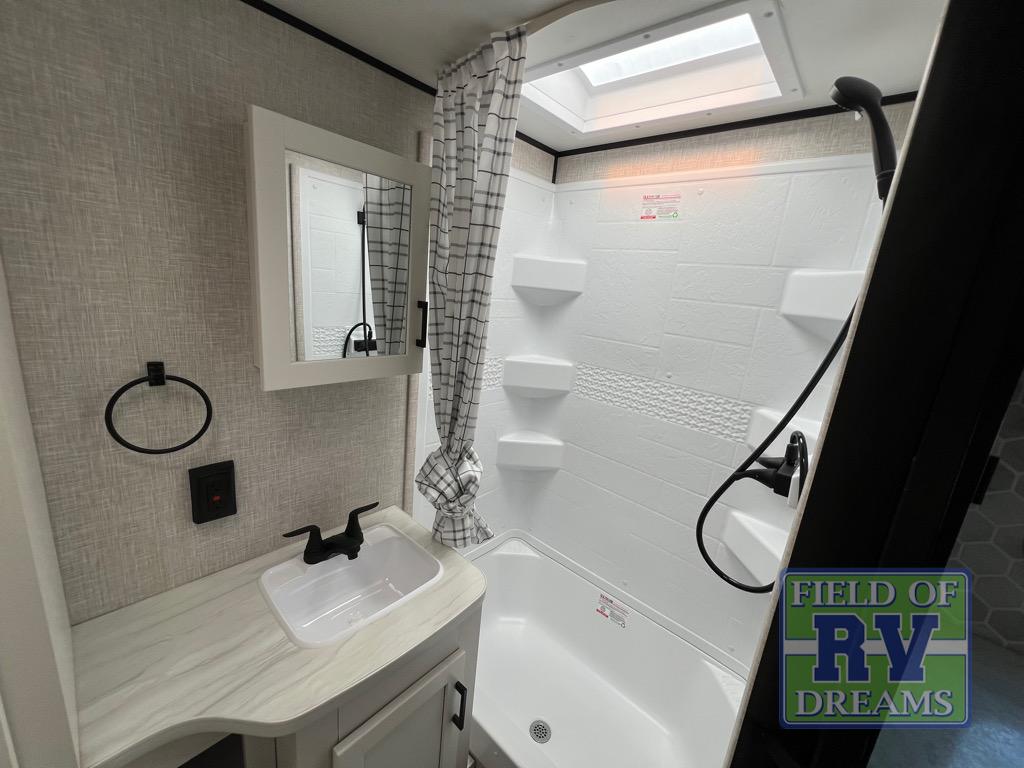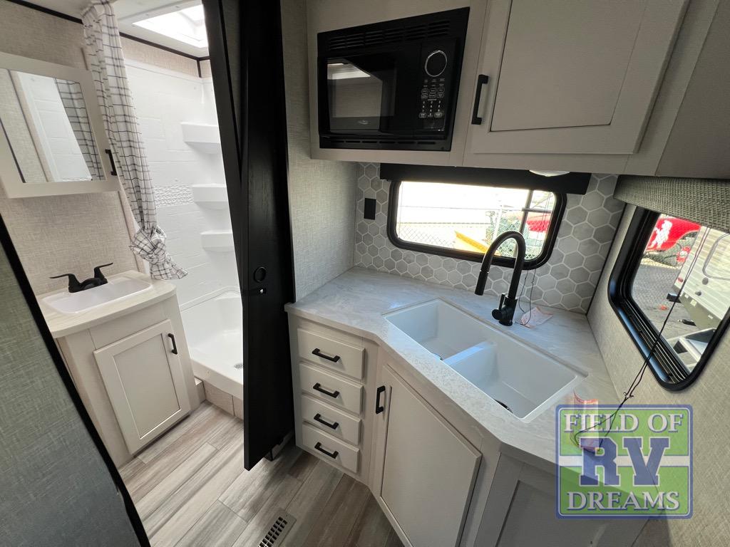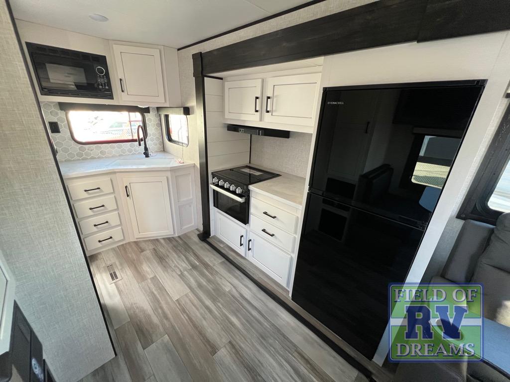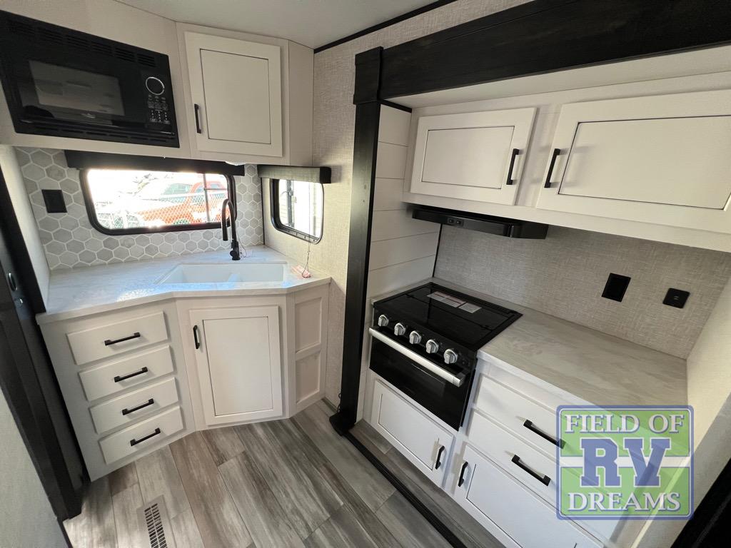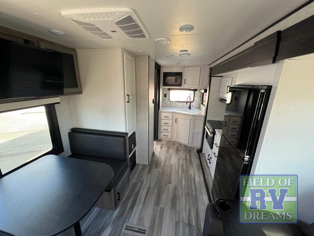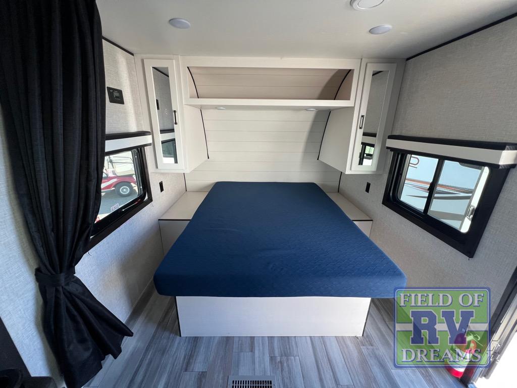 You will have a comfortable camping trip in this travel trailer! It offers full kitchen amenities including a pantry for snacks and such, plus a full rear corner bathroom for privacy and includes a shower. When you need a break, the semi-private bedroom up front offers a queen bed, dual wardrobes and a curtain to close, and the booth dinette can transform into a sleeping space as well. There is a 18' power awning with LED lights for you to enjoy this outdoor space into the night, plus exterior storage for your outdoor games and gear.