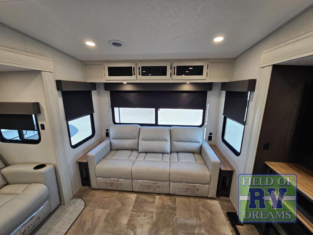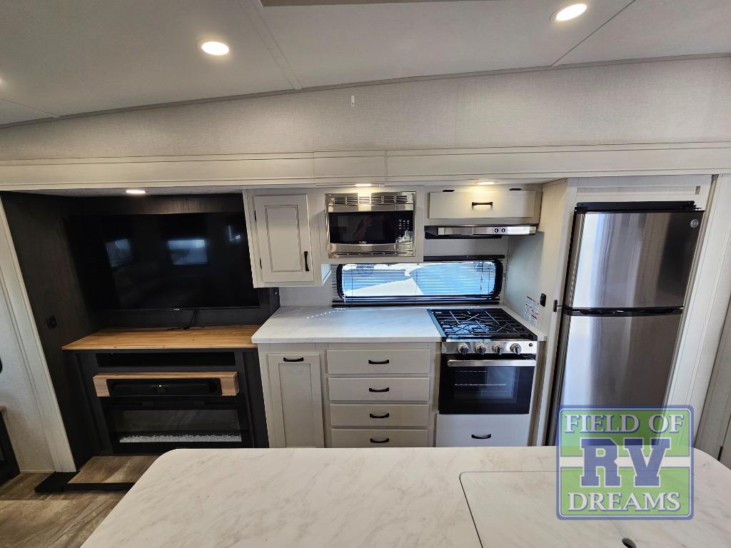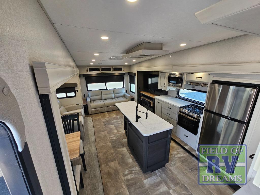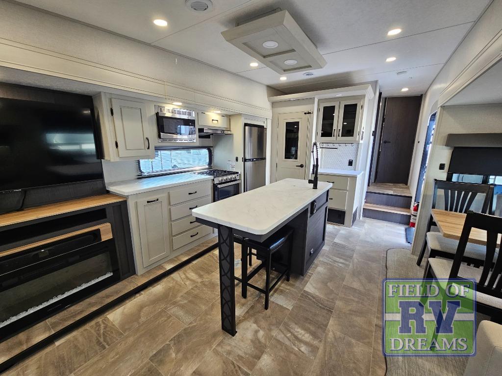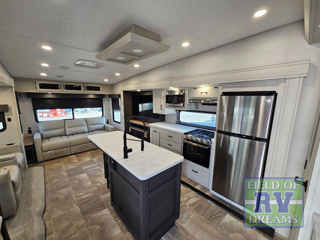 Get ready for a luxurious getaway in this fifth wheel! The rear living area is the perfect place to wind down your nights by relaxing on either the 78" tri-fold hide-a-bed sofa or the theater seating across from the entertainment center. You could even play a few card games at the free-spanning table while enjoying snacks that were stored in the pantry. The kitchen island comes with two bar stools so you can have two helpers get dinner ready while you're cooking on the three burner cooktop. The dual entry bathroom is easy for everyone to access and has a radius shower with glass doors to freshen up in, plus it leads directly into the front master suite where you will find a queen bed to lay your head on at night and a wardrobe/linen slide to keep your clothes looking their best!