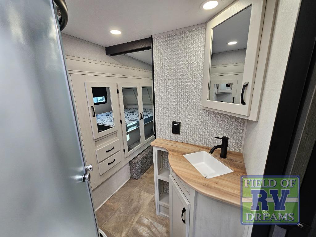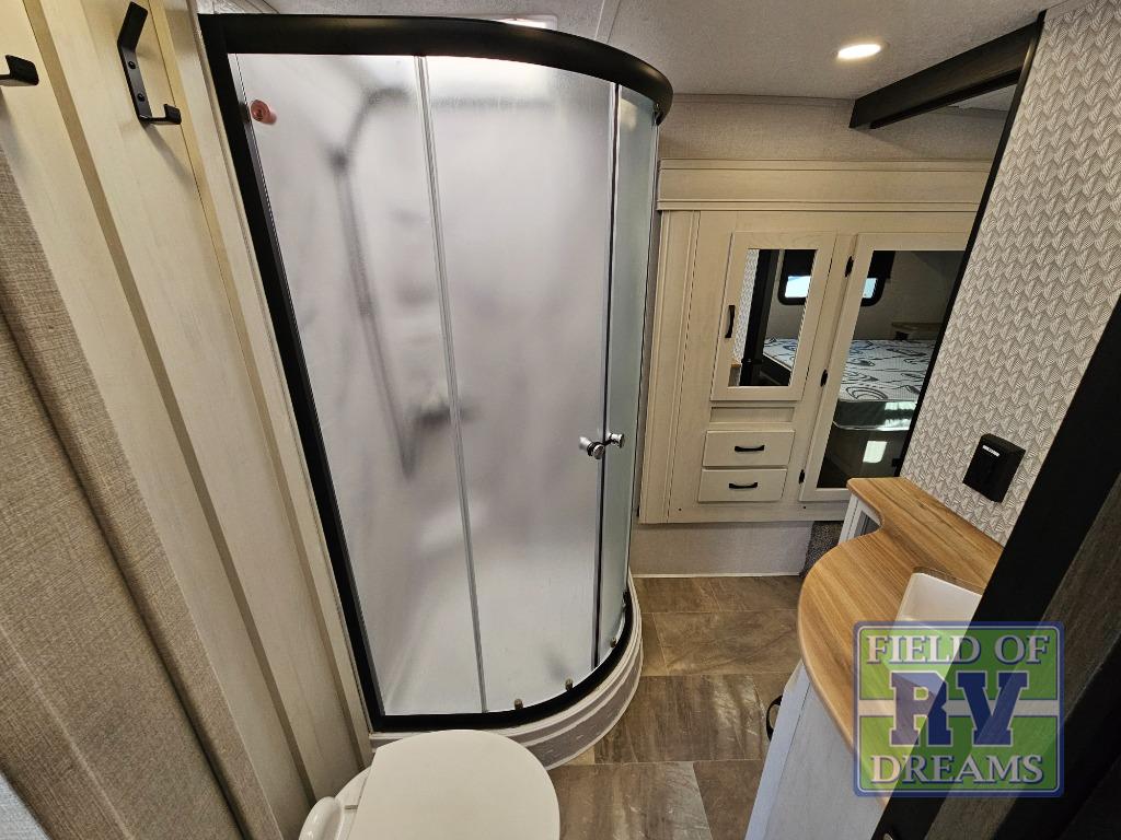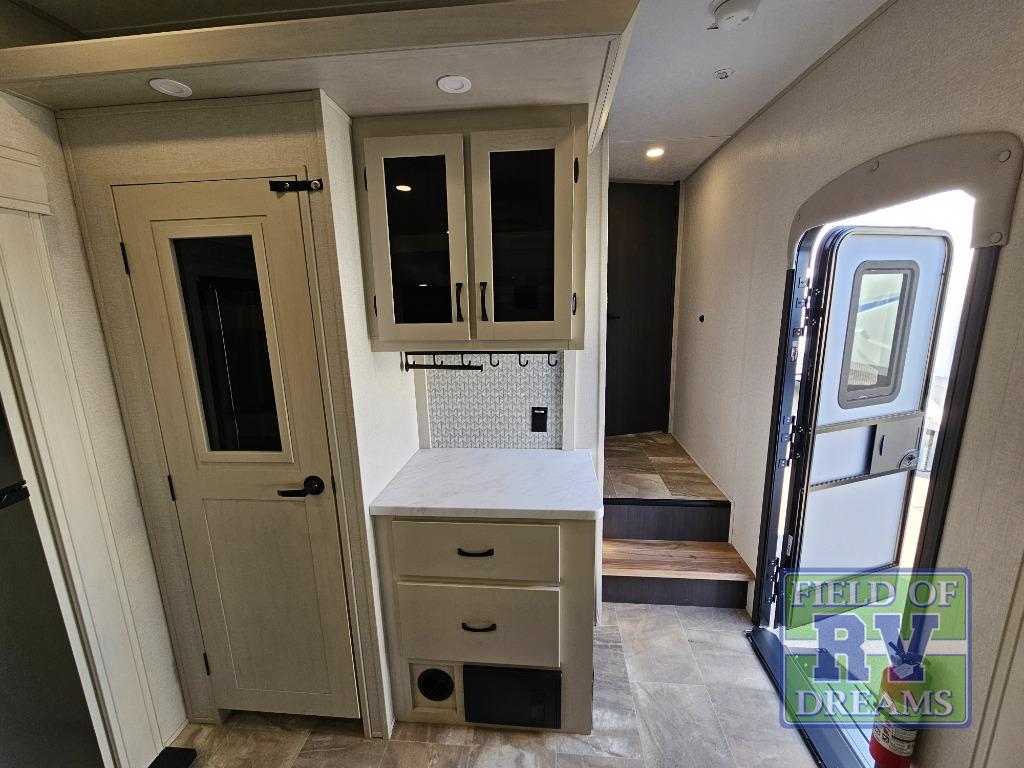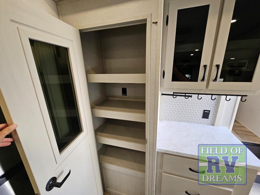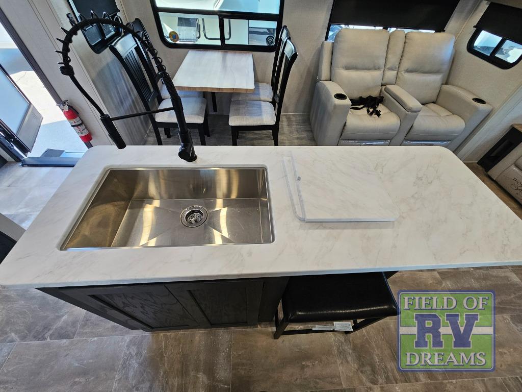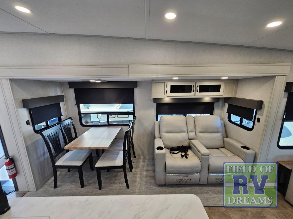 Get ready for a luxurious getaway in this fifth wheel! The rear living area is the perfect place to wind down your nights by relaxing on either the 78" tri-fold hide-a-bed sofa or the theater seating across from the entertainment center. You could even play a few card games at the free-spanning table while enjoying snacks that were stored in the pantry. The kitchen island comes with two bar stools so you can have two helpers get dinner ready while you're cooking on the three burner cooktop. The dual entry bathroom is easy for everyone to access and has a radius shower with glass doors to freshen up in, plus it leads directly into the front master suite where you will find a queen bed to lay your head on at night and a wardrobe/linen slide to keep your clothes looking their best!