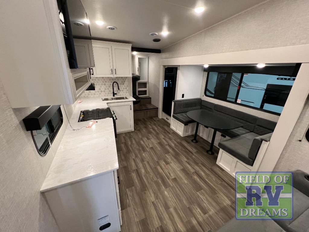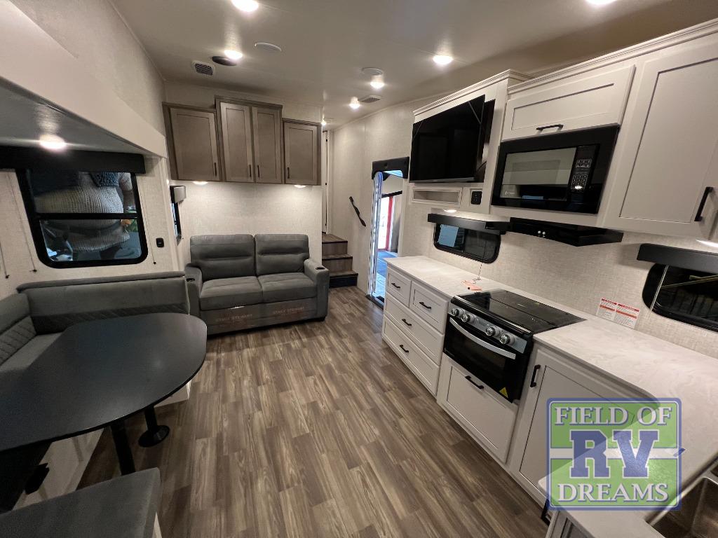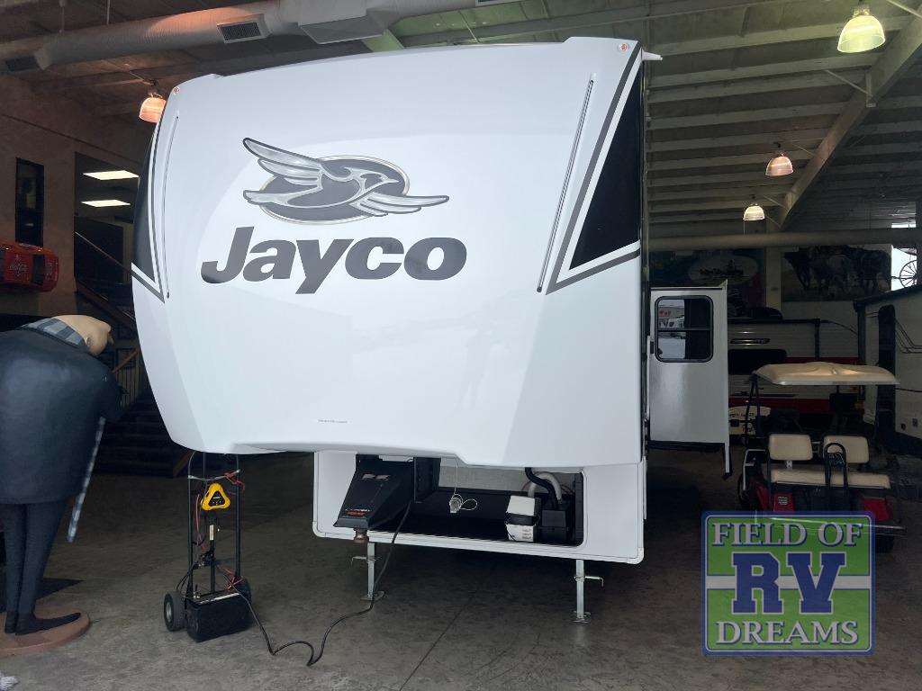 With any Eagle SLE fifth wheel by Jayco, you will enjoy a lighter tow weight, high-end finishes, and the same quality construction you've come to expect from Jayco! There is an Alpha Ply TPO roof membrane, a fully enclosed and heated underbelly, plus Stronghold VBL walls for added durability. There is also a rear 2" towing receiver outside, along with metal slam latch baggage doors, MORryde Step Above entry steps, and a Winegard Air 360 antenna with router prep if you want to stay connected as you camp. Once inside you'll enjoy the handcrafted and glazed door/drawer fronts, blackout pleated shades throughout, and residential vinyl flooring throughout with no carpet for an easier clean. The on-demand water heater, 30K BTU furnace, and 15K BTU "Whisper Quiet" A/C will ensure your comfort year around, and the optional Overland 1 Solar Package can be added if you need off-grid capabilities!