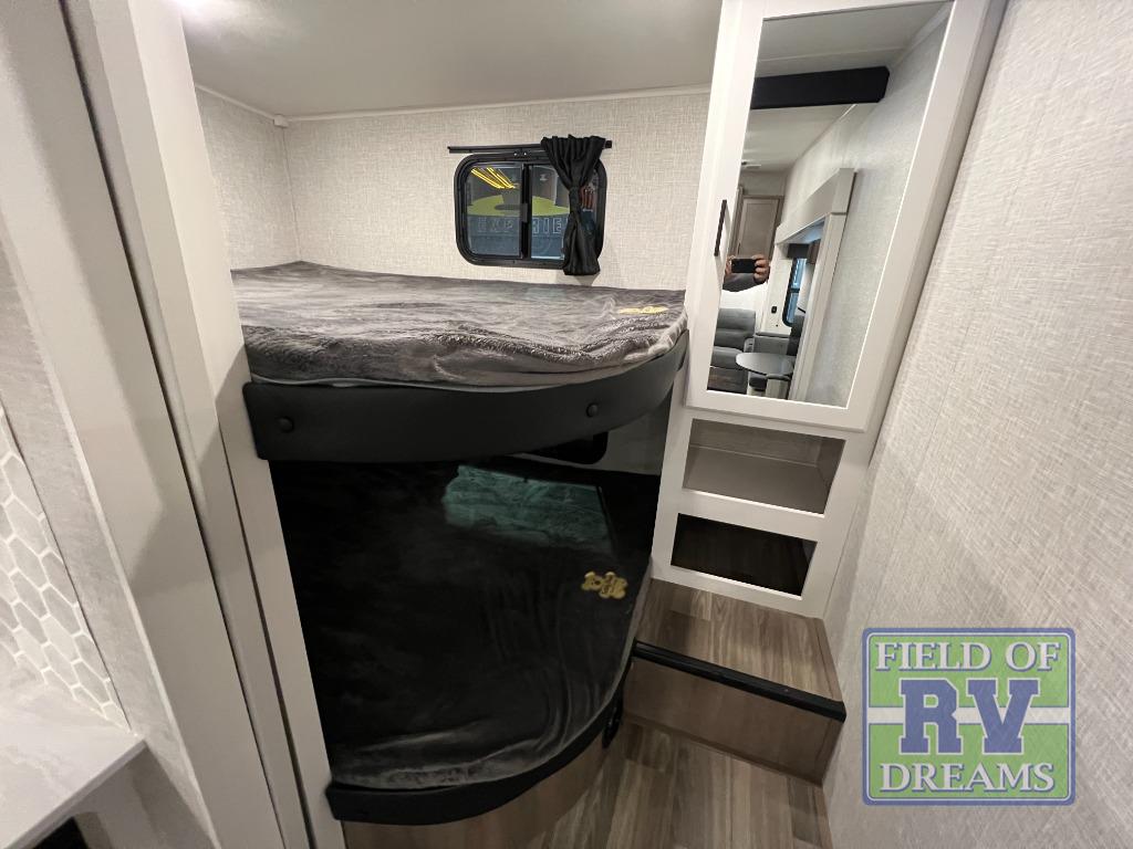 If you enjoy camping with a larger group, this fifth wheel is perfect for you! The rear bunkhouse includes double-size bunks, bunk storage and a wardrobe to keep this space tidy. You'll have the front private bedroom all to yourselves with a queen bed, and if you have any other guests, they can sleep on the tri-fold sofa and U-shaped dinette in the main living area. This space is also shared with the full kitchen, complete with a microwave and range, 12V refrigerator, and plenty of overhead cabinets for storage. After dinner, head outdoors to enjoy the 19' power awning with LED lights as you relax in your camp chairs!
