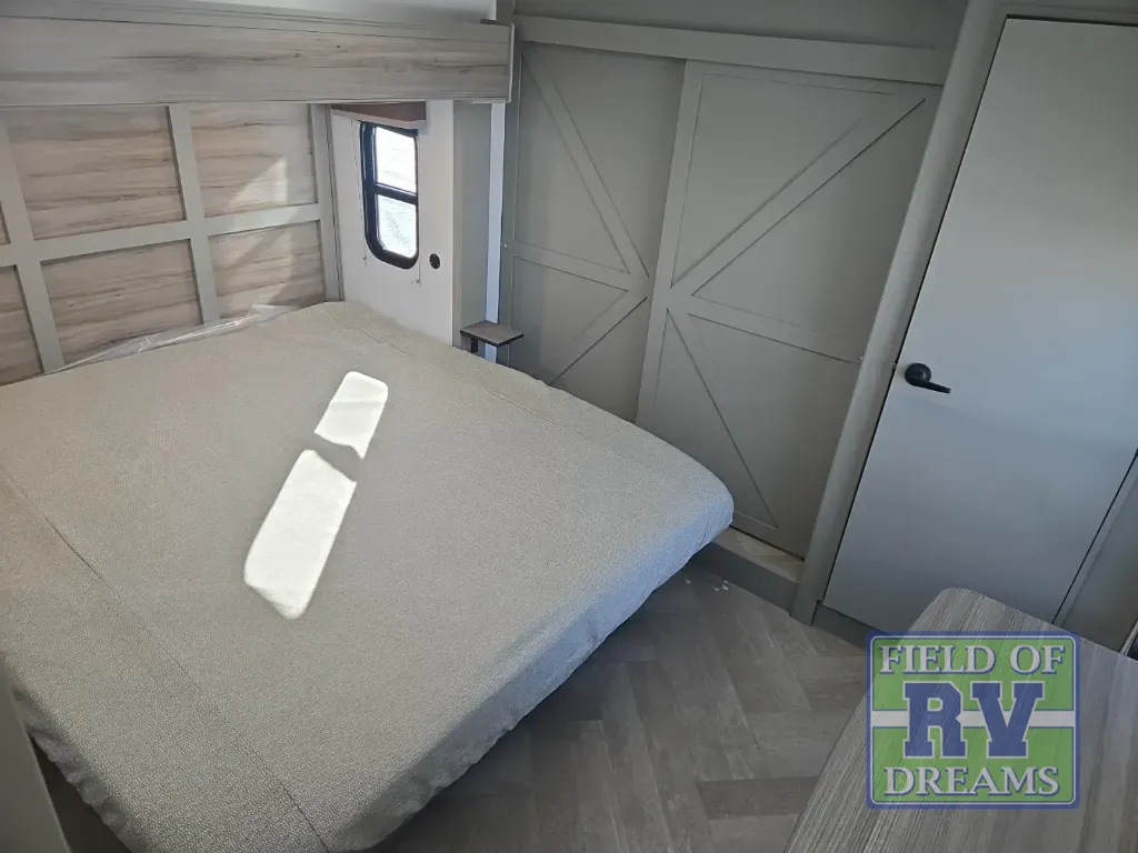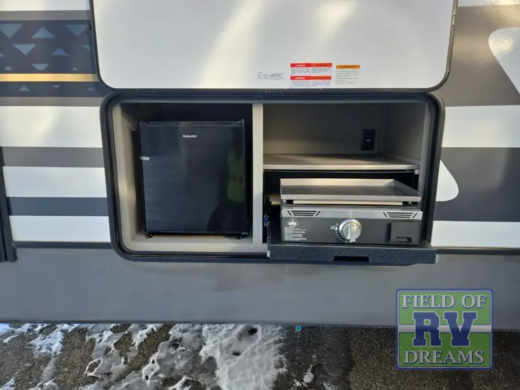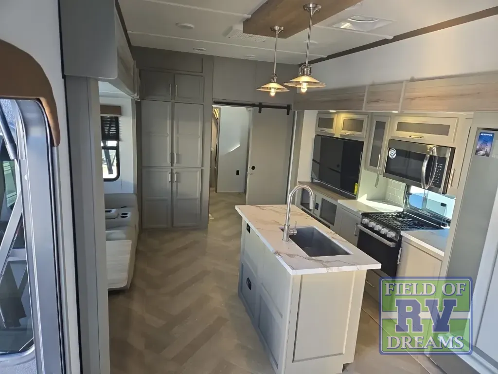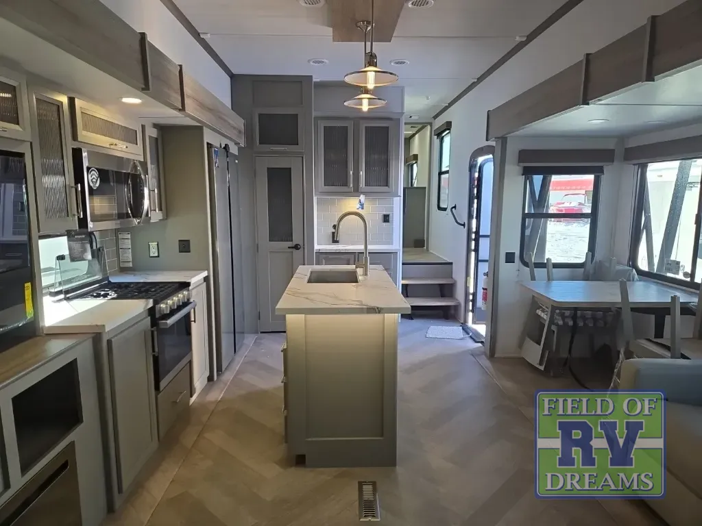 A great family bunkhouse fifth wheel featuring quad slides that really open this entire unit up to provide spacious living throughout. A booth dinette or optional free standing dinette is great for meals, and full reclining theater seating with massage, lights, and USB connectivity make movie night a real treat! The kids will love the rear bunkhouse with a separate bath and private entry for easy access when outside. There is even a loft area above for storage, so they can bring a few friends along as well. The kitchen has all of the features needed to allow you to cook and entertain when you want with a three burner range including a glass top, a 16 cu. ft. 12 volt refrigerator, pantry, hutch for dishes and things, plus a solid surface countertop on the center island that houses your sink. In the bedroom, a king bed slides out to offer more floor space to move about, plus you will find ample storage in the front wardrobe which has also been prepped for a washer and dryer if you choose to add. You can also add a TV in the bedroom since it has been prepped for one as well. And let's not forget the outside two burner cooktop and refrigerator!