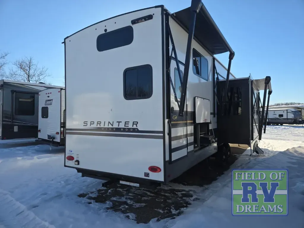 The Sprinter fifth wheels by Keystone feature spacious living areas, plenty of storage, and outstanding towability. Each unit is constructed with 2" aluminum framed and laminated sidewalls, a fully walkable roof, and dual layer insulation to help extend your camping season. The heated pass-through storage includes lockable slam latch baggage doors so you can easily pack your gear, and the one-touch 4-point leveling system features return hookup memory to have you set up in no-time. Head inside to find Congoleum vinyl flooring, Thomas Payne luxury collection furniture, residential style seamless marbled countertops, and an upgraded bedspread to name a few comforts. The Sprinter also includes a Girard tankless on-demand water heater, a central command center, plus a 30k BTU furnace and two A/C units to ensure your comfort!