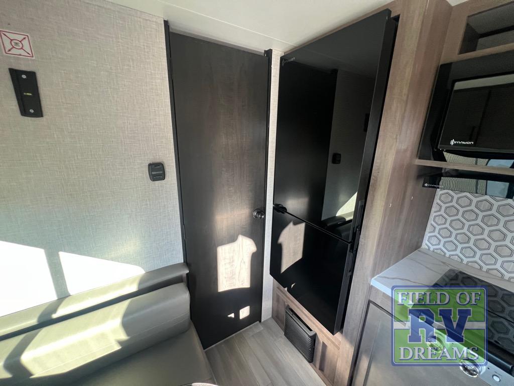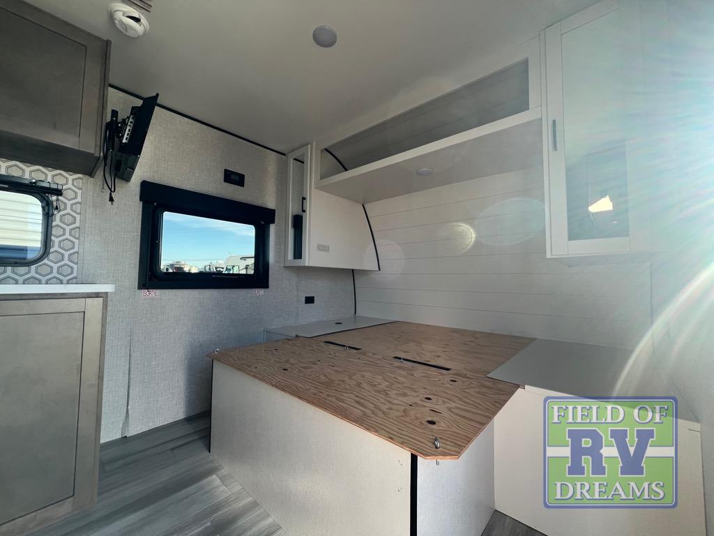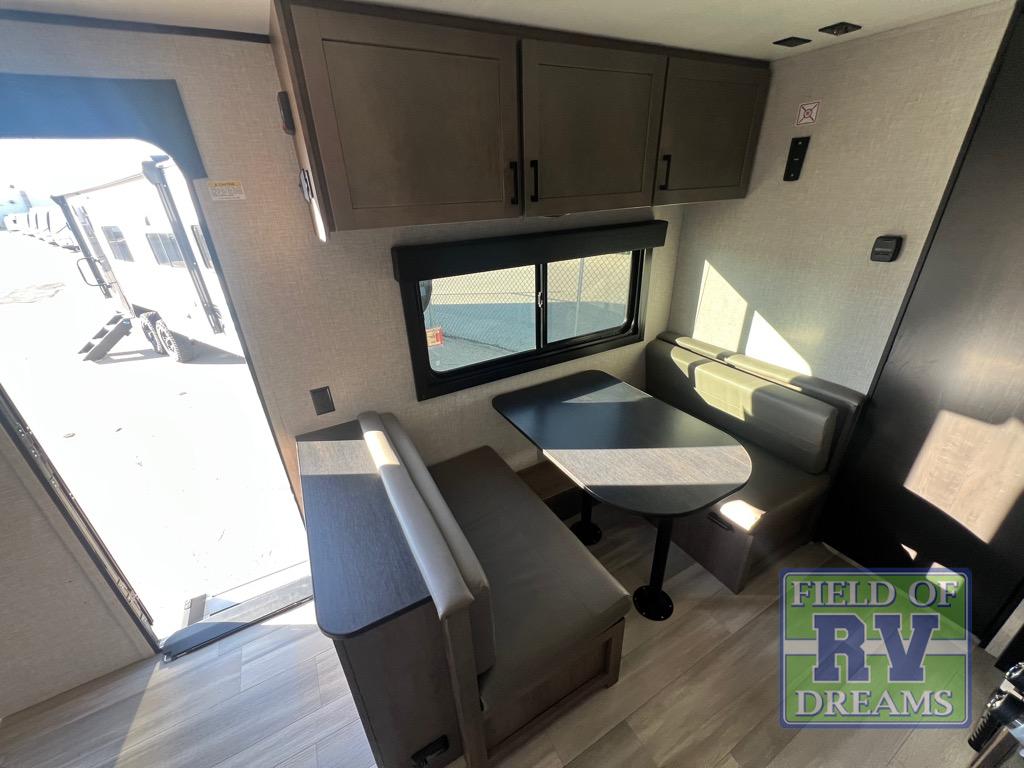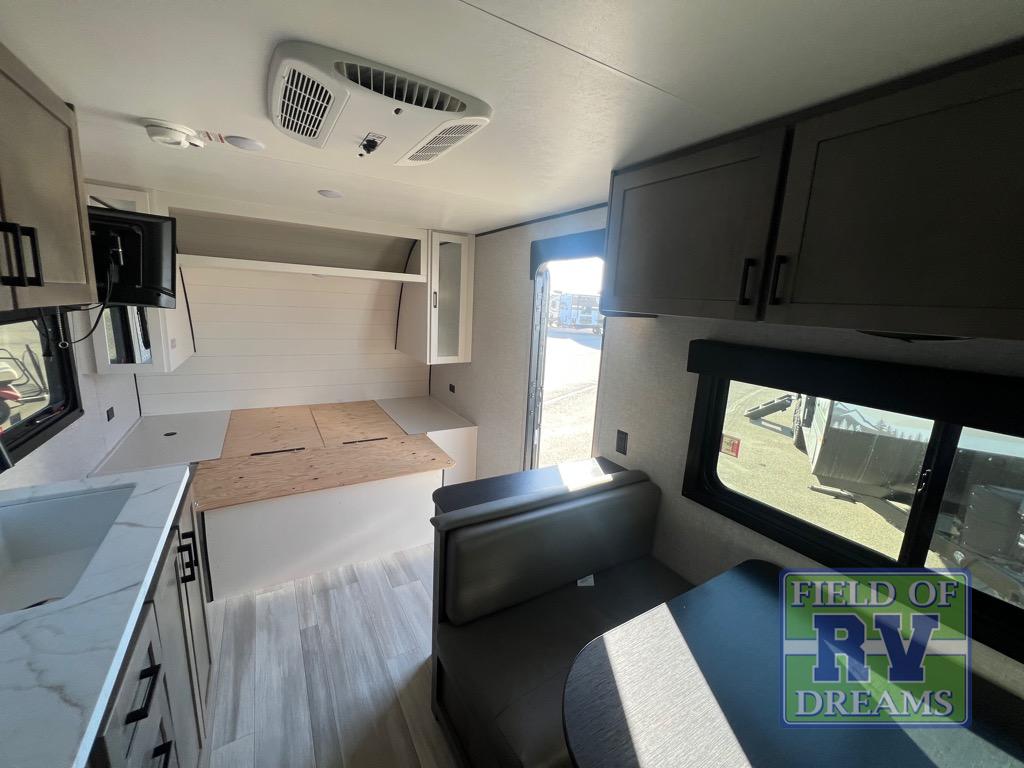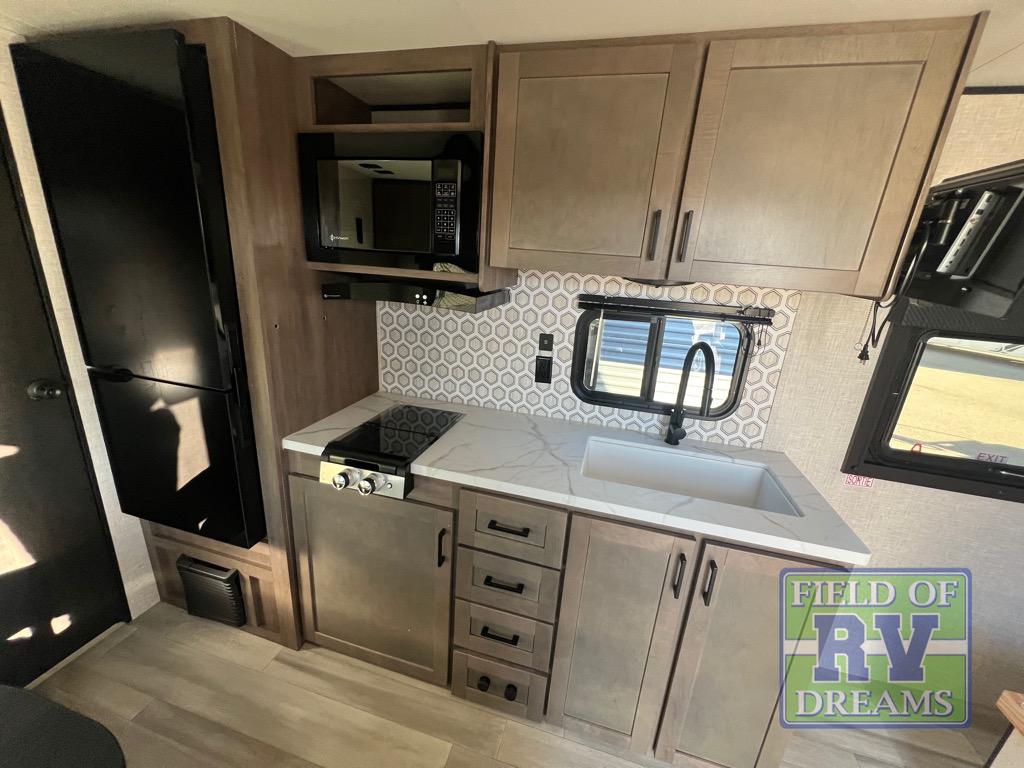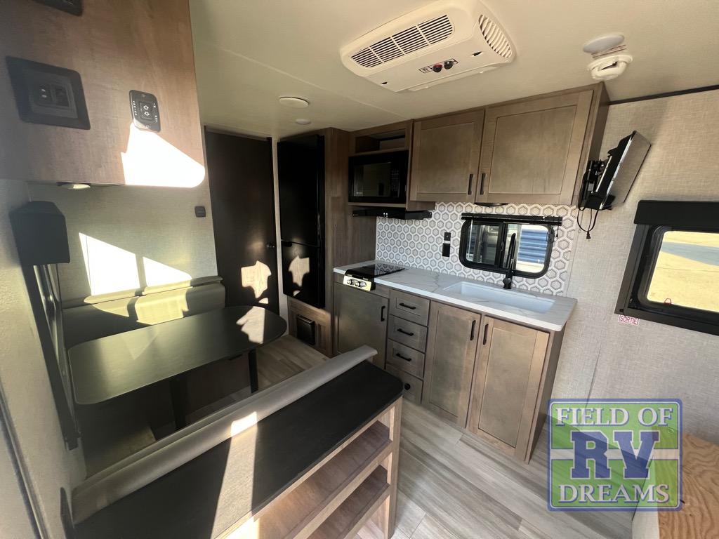 This cozy single axle travel trailer can sleep three people comfortably thanks to the front walk-around bed and the booth dinette. There is a full rear bath with a foot flush toilet, a powered bath vent, plus a bath wardrobe for clean towels and toiletries. The full kitchen is complete with a two burner cooktop, a microwave oven, and a refrigerator to keep your perishables fresh. Start camping today at your favorite campground!